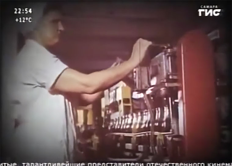 | В середине фильма, когда рассказ ведется о предприятиях города, повествование вновь возвращается к "Жигулевскому пивзаводу". Диктор читает: "по числу и масштабу предприятий Куйбышев может быть и похож на другие большие города, но "Жигулевский пивкомбинат" - остается единственным в своем роде. Этим куйбышевцы обязаны старейшине волжских пивоваров - Александру Николаевичу Касьянову". Нам показывают линию розлива, а также заводскую дегустацию пива. Среди бутылок слева видно "Московское", а справа - "Жигулевское" (цветовая гамма несколько необычная, но это явно от того, что пленка за полвека выцвела да и соседняя бутылка отбрасывает такую тень, в дальнейших кадрах цвет этой этикетки все таки становится ближе к привычной желто-синей). | ||||||||||||||||||||||||||||||