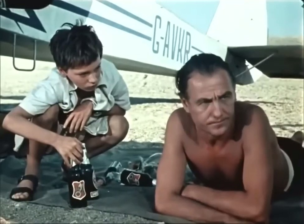 | "Последний дюйм" - цветной художественный приключенческий фильм-драма, снятый на киностудии "Ленфильм" в 1958-м году режиссерами Теодором Вульфовичем и Никитой Курихиным по одноименному рассказу Джеймса Олдриджа (этот рассказ был впервые опубликован именно на русском языке в 1957-м году). В главных ролях Слава Муратов и Николай Крюков. Действие происходит в послевоенные годы, на побережье Северной Африки. По роману - это тогда еще малоизвестная рыбацкая деревушка под названием Хургада. Снимали же - на Каспийском море, в городе Баку, в том числе на аэродроме в поселке Бина (будущий бакинский аэропорт Бина, ныне им. Гейдара Алиева). Главный герой, бывший военный летчик, захватив с собой сына (10-11-ти лет) отправляется на съемки акул. Летят они на самолете Taylorcraft Auster, в фильме использован подобный ему советский самолет Як-12. В качестве пития он захватил с собой только дюжину пива (так как не хотел сначала брать сына с собой), потому в фильме присутствует такой диалог: - а ты что будешь пить? - придется пиво, воды то нет. - что же ты мне не напомнил... Пиво мальчику совсем не зашло - глотнул и выплюнул, а пьется немецкое пиво Beck's. "Beck's" - марка пива, производимого компанией Brauerei Beck & GmbH в Германии из города Бремен. Пивоваренный завод был основан 27-го июня 1873-го года под названием Kaiserbrauerei Beck & May o. H. G. Людером Рутенбергом, Генрихом Беком и Томасом Маем. Это пиво активно поставлялось на экспорт и самые сложные времена для него были во время мировых войн. С 1945-го по 1948-ой год пивоварня не работала, но в 1950-х годах импорт (а значит и производство пива) - опять наладились. С 2002-го года компания принадлежит международному концерну Interbrew (AB InBev). На бутылках хорошо видна контрэтикетка в виде красного ключа - фактически, это герб города Бремена только наклоненный в противоположном направлении. |