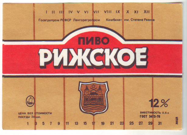 | "Город" - художественный фильм снятый режиссером Александром Бурцевым на киностудии "Ленфильм" в 1990-м году. В фильме можно видеть Бориса Гребенщикова и других музыкантов группы "Аквариум", Дмитрия Шагина ("Митьки"), также в изначальной версии фильма должен был сниматься Александр Башлачев (которому фильм и посвящен), но он погиб в день съемок. В версии фильма 1988-го года можно увидеть Виктора Цоя, но к моменту подготовки окончательной версии картины Виктора Цоя тоже уже не было в живых. В итоге было решено взять на роль Юрия Шевчука. Собственно Дмитрий Шагин и замечен с пивом (и не только). В одной из сцен, на столе уставленном бутылками со всевозможными спиртными напитками видно и бутылку пива "Рижское", а в другой сцене - мы видим его с кружкой пива, которую он пьет на морозе (кружка - типичная граненная общепитовская). "Рижское" - скорее всего пивзавода "имени Степана Разина", дизайн этикетки этого сорта в то время был именно такой. Такой же дизайн был у "Рижского" от "Балтики", но во время съемок фильма скорее всего это пиво еще не выпускалось. |