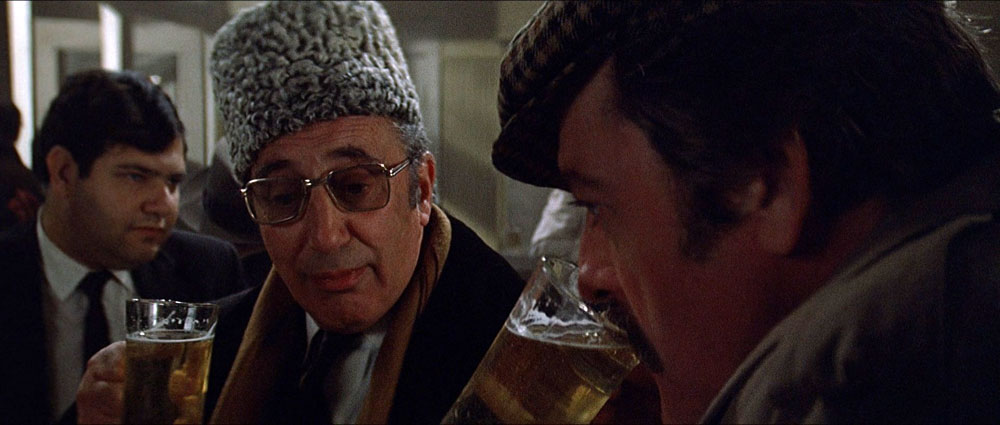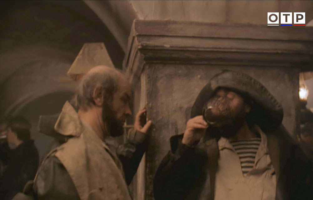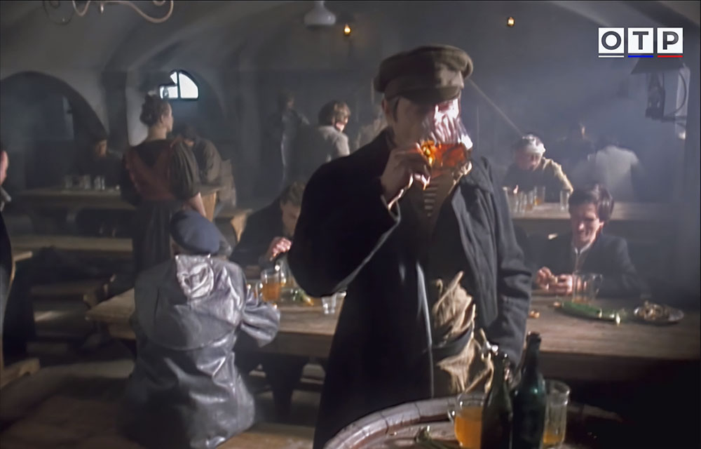 | Кроме пивной палатки, мы видим и пивную, расположенную прямо на ипподроме. Здесь имеется как разливное пиво, так и бутылочное. Скорее всего и то и другое - местного "Псковского пивзавода" - "Жигулевское", бутылочное почти точно, на этикетке слева явно видно черную кляксу - вероятно являющуюся гербом завода. Пиво пьют из общепитовских кружек, конечно подкрепляя выпитое водкой. Герой пьет водку из рюмки, но рассказывает байку - что правильнее ее называть лафитником (в этом он не прав). Пиво-медоваренный завод в Пскове построил Г. Г. Даниэльс в 1883 году (другие даты основания - 1884 и 1886 гг.). Еще до Революции - его чуть не снесли во время строительства моста для железной дороги Псков - Рига. Но завод пережил и Революцию, и Гражданскую с Великой Отечественной войной и закрыт был только в 1997-м году. Кстати, на Ипподромной улице в Пскове, в середине 70-х годов заработал еще один пивзавод, на базе местного пищекомбината облпотребсоюза, с югославским оборудованием. Но в кадре точно пиво не от него, так как этикетки "Жигулевского" у него были совсем другого - "потребсоюзовского" дизайна. |