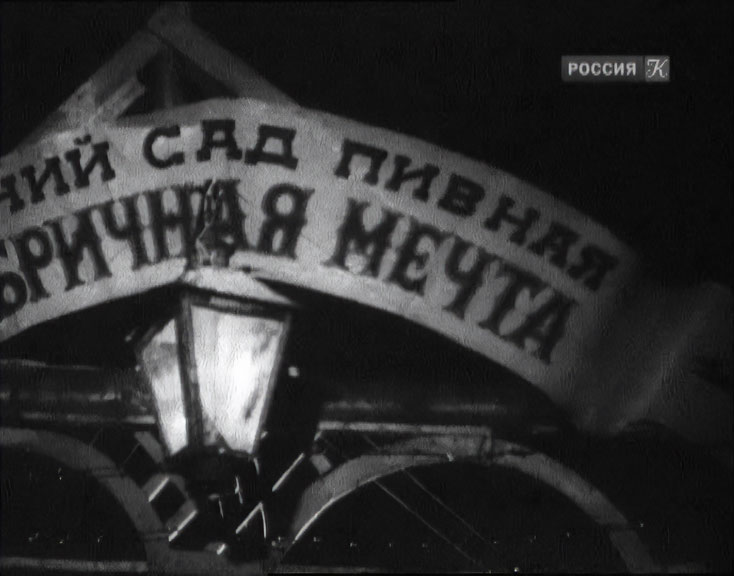 | "Кружева" - черно-белый, немой художественный фильм снятый режиссером Сергеем Юткевичем на киностудии "Совкино" в 1928-м году. Фильм снят по мотивам рассказа М. Колосова "Стенгаз" и рассказывает о жизни рабочей молодежи конца 1920-х годов (работающих на текстильной фабрике производящей кружева). Первая постановка Сергея Юткевича, а от себя отмечу весьма изобретательную работу оператора. В фильме есть два эпизода с пивом, первый - распитие пива на природе, но там детали сложно разглядеть, во втором эпизоде, показан летний сад и пивная "Фабричная мечта". В пивной предлагается бутылочное пиво московского "Трехгорного пивзавода". Видны бутылки 0,6 литра с гербом завода, они закрыты корковыми пробками типа винных и открываются штопором. Этикетки подробно рассмотреть сложно, дизайн скорее всего такой (этикетки приведены ниже), на одном из кадров название вроде бы читается как "Кульмбахское", возможно другие этикетки пива это "Светлое №2" - ОСТовская версия "Пильзенского" (сам ОСТ как раз вступил в действие в 28-м году). Кружки широкие, не граненные, а с рисунком в виде выемок и похоже объема 0,6 л. В пивной видно много всяких плакатов, как самого "Трехгорного пивзавода", так и самодельных - "Пивом себя тешь", "В кредит ни кому, хотя бы и вам", "Чистота - здоровья друг", "По воскресеньям - свежие раки" и т. д. Выпивается в пивной не мало бутылочного пива, потому в погребе целые залежи пустых бутылок в корзинах. Публика в пивной - рабочая, по тогдашней моде, местные хулиганы носят кепки в клоунскую клетку. В конце фильма - комсомольцы пивную закрывают и открывают вместо нее летнюю площадку Клуба. | ||||||||||||||||||||||||||||||