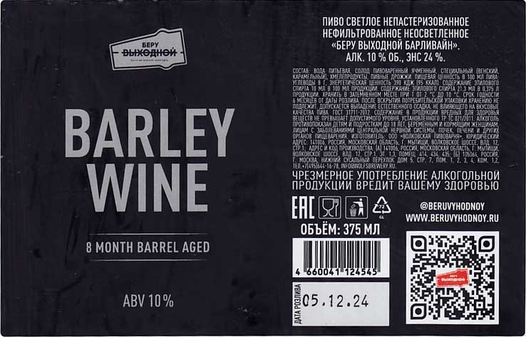 Беру выходной, барливайн. Светлое. Плотность - 24%. Крепость - 10% vol. Калорийность - 95 ккал. |