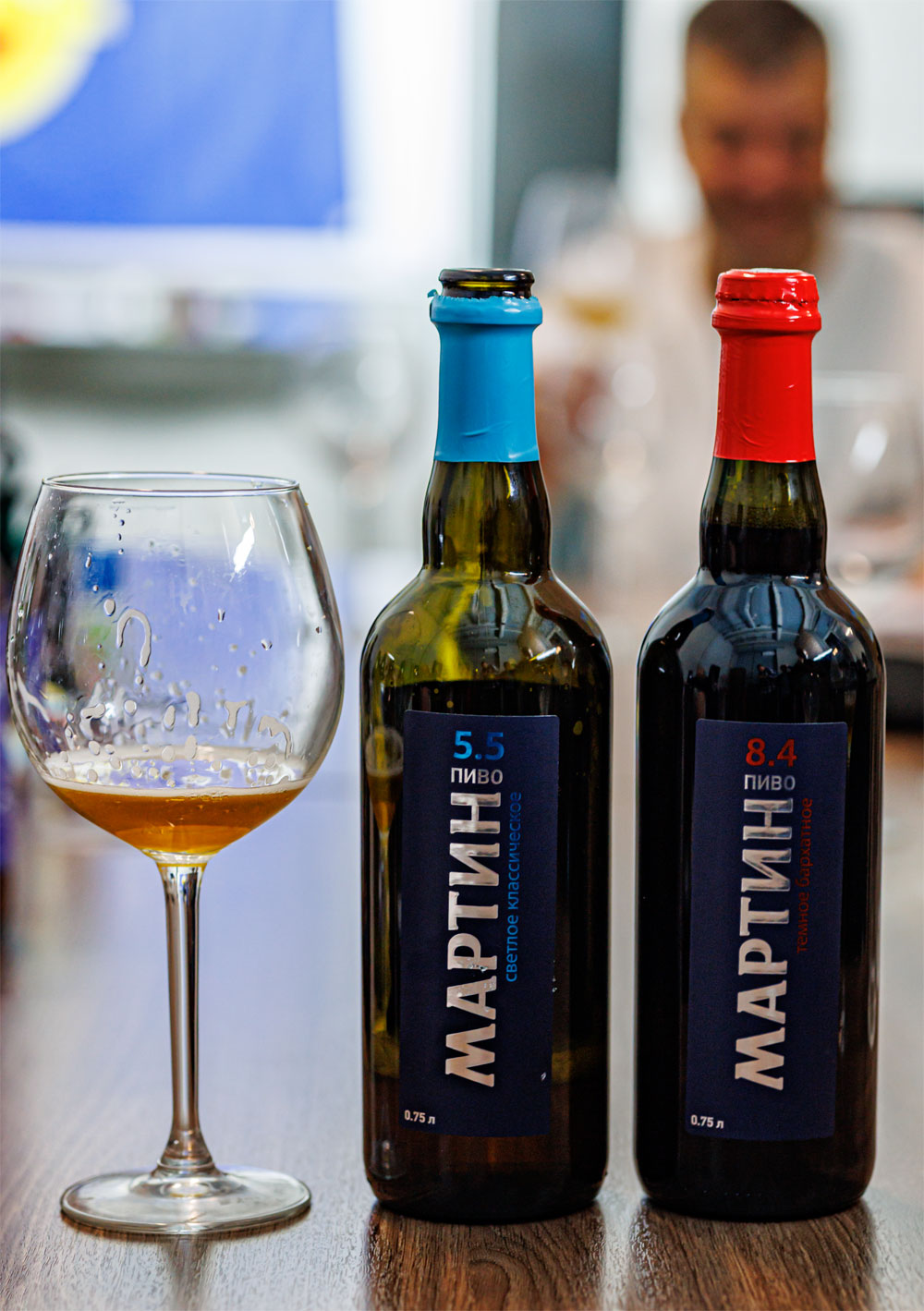 | Дополнительно, были продегустированы два сорта от "Мартин Аква" из Белой Глины (производителя известных семечек "От Мартина"). Пиво было розлито в винные бутылки с корковой пробкой и хотя упаковка явно "премиальная" - пиво весьма простое. "Мартин, светлое классическое" - довольно чистый и не сильно полный солодовый вкус. Фактически - классическое живое-минипивоваренное. "Мартин, темное бархатное" (18% плотности на 8,4% алкоголя) - теоретически - это доппельбок, но нет мощи и яркости, скорее вкус пустоватый, ощущается только карамельность, крепость правда - хорошо скрыта. | ||||||||||||||||||||||||||||||