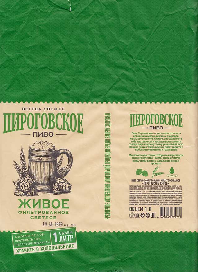 | "Московская Пивоваренная Компания", банка "Кружечка чешского" с акцией "Рыбачим вместе". Чисто, пусто, питко. Новый сорт - "Пироговское, Живое" - в литровом ПЭТе, этикетка в виде листа бумаги обернута вокруг бутылки. В общем - это такая же "Кружечка чешского" но вид с боку - непастеризованное. Вкус чистый, довольно пустой и малоохмеленный. Наконец, "Жигули барное" - на этикетке в очередной раз что-то поменяли в надписях, хотя общий дизайн - не изменен. Здесь тоже все очень чисто, но и солод ощущается лучше и хмель солод балансирует, так что вкус пополней и поплотней. |