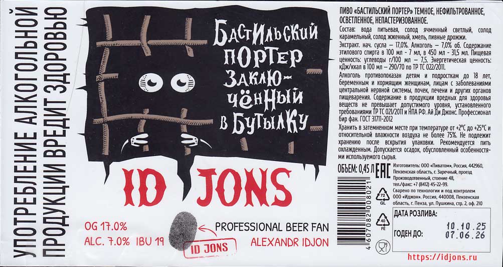 | Несколько этикеток с фестиваля "Крафтомания". ID Jons, "Бастильский портер", сварено на "Пиватоме", на этикетке изменения в расположении штрихкода и дат. Лагерная основа здесь заметна тем, что вкус немного смещается от портера к темному боку. Заметны карамельные и темные солода, все довольно чисто, не переслащено и вполне питко. |