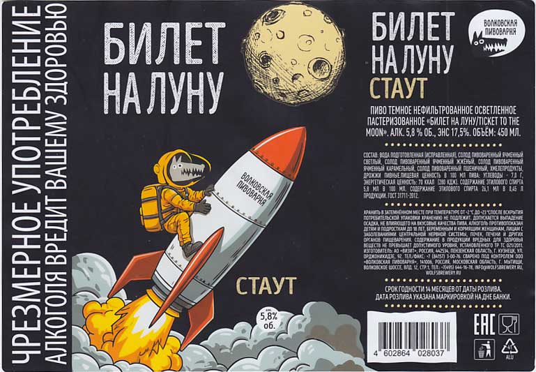 | "Волковская пивоварня", сварено на "Визите". "Билет на Луну" - умеренно плотный и крепкий стаут, отлично выражены темные и карамельные солода, совсем немного жженки - потому вкус больше шоколадный, чем кофейный, довольно питкий, сбалансировано сладковатый. Совместная варка с "Василеостровской" - "Васька и Волчок, арахисовый стаут" - тоже вкус темных и карамельных солодов, но здесь явно выделяется орех, заметен и шоколад, и здесь - весьма сладко. |