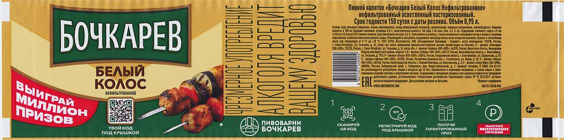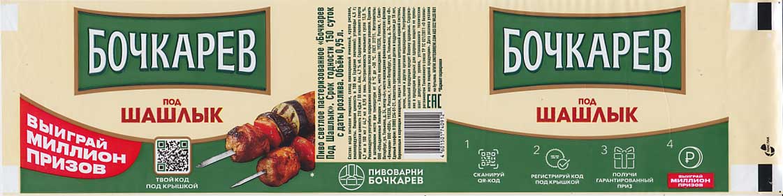 | "Объединенные пивоварни - Холдинг" - продолжают окучивать шашлычную тему и выпустили даже новый сорт - "Бочкарев, под шашлык". Параметры - удивительные для крупного завода - 13% плотности на 4,7% алкоголя ("Балтика" в "Московском", при такой плотности меньше 5,8% сделать не смогла). Однако по вкусу этого не скажешь, не ощущается полнота, пиво кажется вполне обычным массовым легким лагерком, в бутылочной версии - довольно чистым, а вот в ПЭТе есть легкая посторонка, все таки ПЭТ как тара, тем более когда они прозрачные, на сохранность влияют не лучшим образом. | ||||||||||||||||||||||||||||||||||||